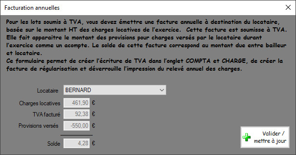 En validant cette interface, le logiciel va ajouter une écriture de TVA dans les onglets COMPTA et CHARGE. Il va aussi créer une facture de régularisation des charges locatives onglet CHARGE.