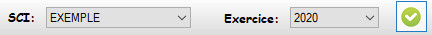 Utilisez alors l'interface suivante pour sélectionner dans les deux listes déroutantes, le nom de la SCI et l'année d'exercice: puis validez avec le bouton de droite.