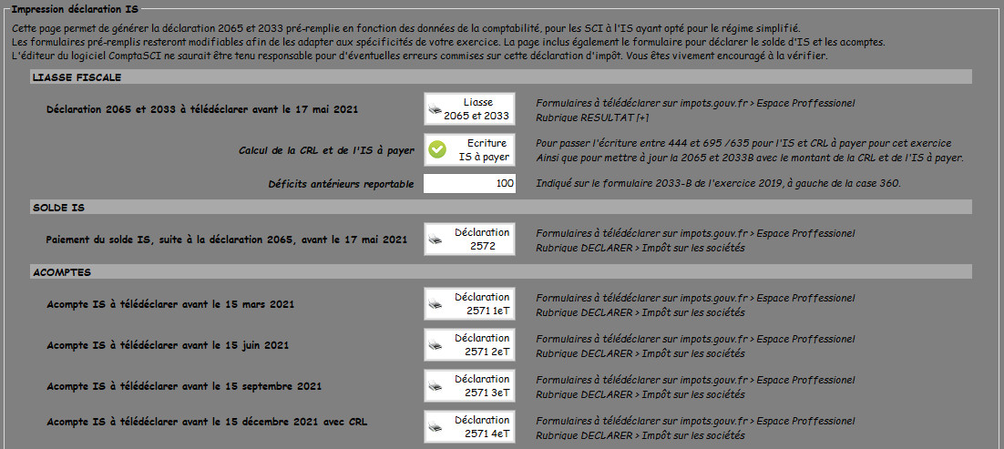Cette partie permet de générer les déclarations 2065 et 2033 par le bouton et de passer les écritures concernant la CRL et l'IS à payer par le bouton