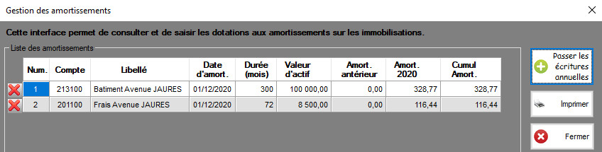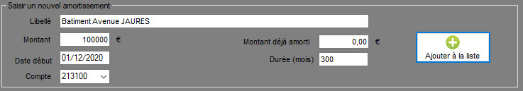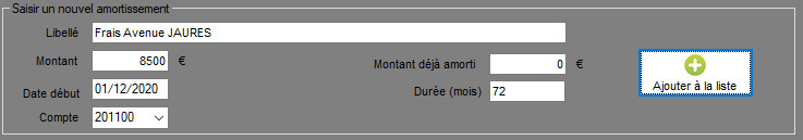 Dans le bas de la fenêtre qui apparaît, renseigner les champs pour déclarer l'amortissement à prendre en compte.