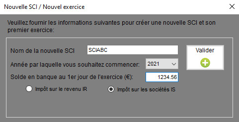 Cliquez sur le bouton puis remplissez le formulaire suivant avec le nom de votre SCI (Ce nom sera seulement utilisé en haut de la fenêtre principale du logiciel).