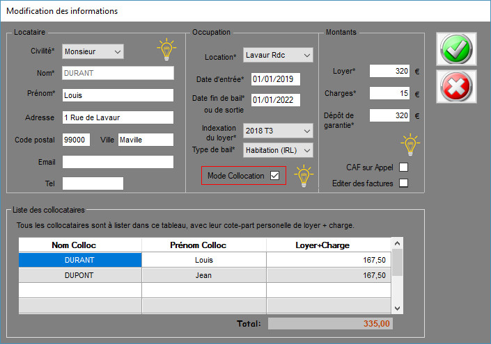 - 'Mode Collocation' permet de lister tous les colocataires présent sur le bail. Cet information est utilisée pour éditer avec l'ensemble des noms, les documents à destination des locataires. Cependant, il faut toujours désigné un locataire dans la partie supérieure de la fenêtre car pour des raisons pratiques, c'est sont nom seul qui sera utilisé dans les interfaces du logiciel. La fenêtre ci-dessous montre un exemple de saisie:
