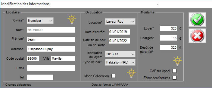 - 'Date de sortie' correspond à la date de fin de bail (en général, date d'entrée + 3 ans) tant que vous ne connaissez pas la date de départ de votre locataire. Lorsque le locataire vous donne son préavis de départ, veuillez l'indiquer dans ce champ.