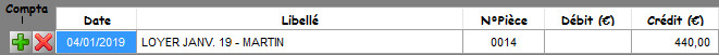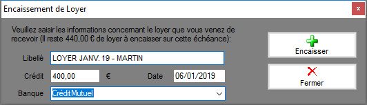 Note: Dans l'exemple ci-dessous, on considère le paiement partiel du loyer: 400,00€ encaissé sur le relevé bancaire le '06/01/2019'.