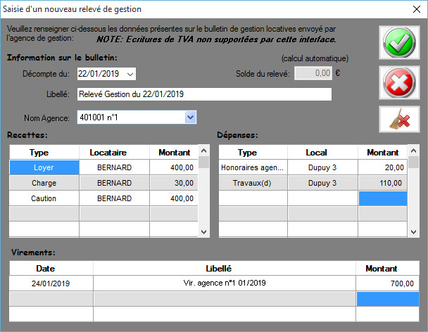 Pour déclarer les loyers encaissés, cliquez sur le bouton . Plusieurs écritures vont être passées automatiquement en banque, dans la compta et dans le compte de charges du locataire.