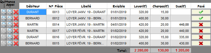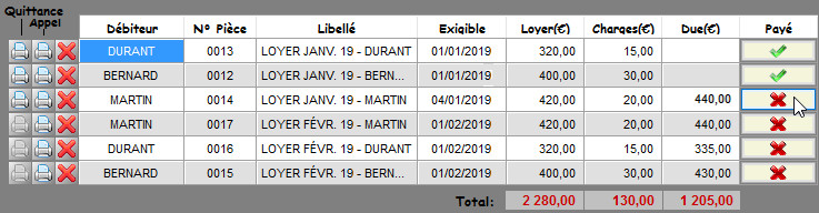 Le locataire MARTIN vient de payer le loyer du mois de JANVIER. Veuillez cliquer sur le bouton de la colonne payé présent sur la même ligne .