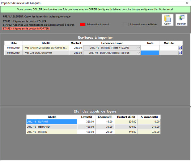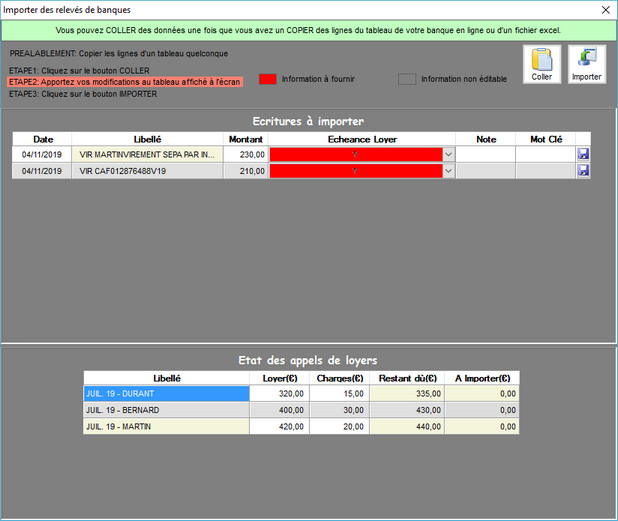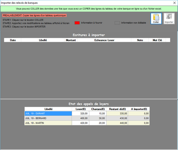 Plusieurs locataires vous ont envoyé par virement leurs loyers. Il est possible de saisir tous ces virements en une seule fois en important une copie du tableau de banque dans le logiciel. Pour cela cliquez sur le bouton . L'interface suivante apparaît à l'écran.
