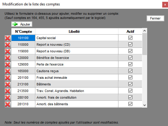 - Les comptes d'associés en 455 et les comptes de remboursement d'emprunt 164, ne peuvent pas êtres ajoutés de cette manière. Il vous faut les ajouter en utilisant les boutons de l'onglet SOCIETE.