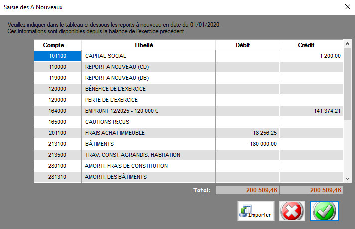 Note: Le solde du tableau des 'A nouveaux', doit être nul. Si il n'est pas nul, alors vous avez une erreur dans votre saisie (ou éventuellement dans votre compatibilité précédente).