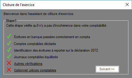 Une fois le bouton Clôture Exercice de cliqué, la fenêtre suivante apparaît. Elle liste des vérifications comptables.