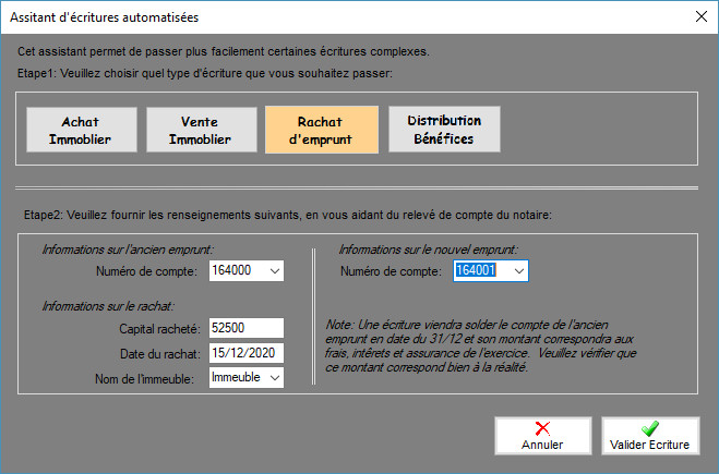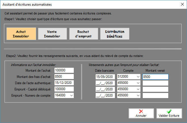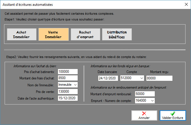 Cet assistant à pour but d'aider l'utilisateur à passer certaines écritures complexe comme l'achat d'un bien, la vente d'un bien, le rachat d'emprunt.