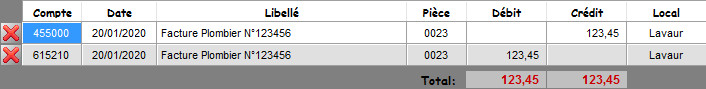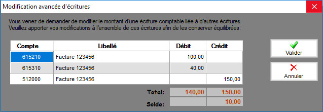 Dans l'exemple ci-dessus le montant de l'écriture sur la première ligne a été modifié de 110,00 à 100,00. Cela entraîne un déséquilibre de 10,00€ qui peut être corrigé en remplaçant le 40,00 par 50,00.