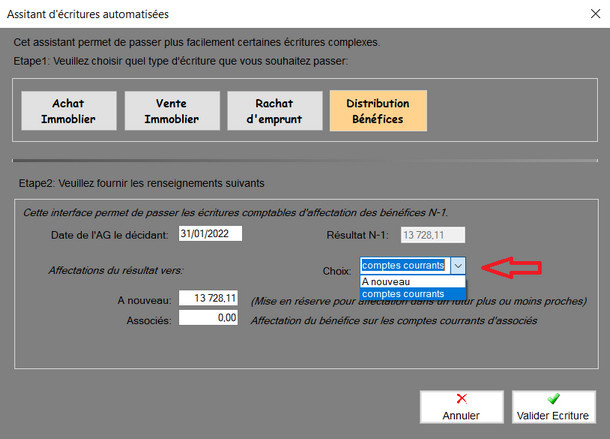 L'utilisateur doit choisir dans la liste déroulante le choix d'affection qu'il souhaite et en fonction de ce choix, le logiciel va proposer une affectation sur compte d'A nouveau (12) ou compte d'associés (455).