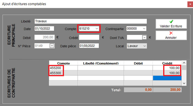 On peut par exemple indiquer le compte travaux 615210 dans la partie haute de la fenêtre et indiquer dans la partie basse les comptes des associés.