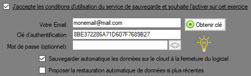 Vous pouvez optionellement choisir de protéger les données exportées par le logiciel via un mot de passe. Ce mot de passe ne devra pas être oublié car sans lui, les sauvegardes sur le cloud deviendront inutilisables, même par l'éditeur du logiciel.