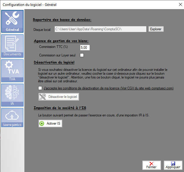Afin d'accéder aux paramètres du logiciel, veuillez cliquer sur le bouton , situé dans le coin supérieur droit de la fenêtre de Comptasci.